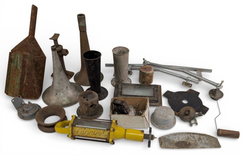 Vintage Automobile Parts: to include Carburol upper lubrication dispenser, car horn parts, bus handrail, Salop CC pump plate part, and other parts (box of)