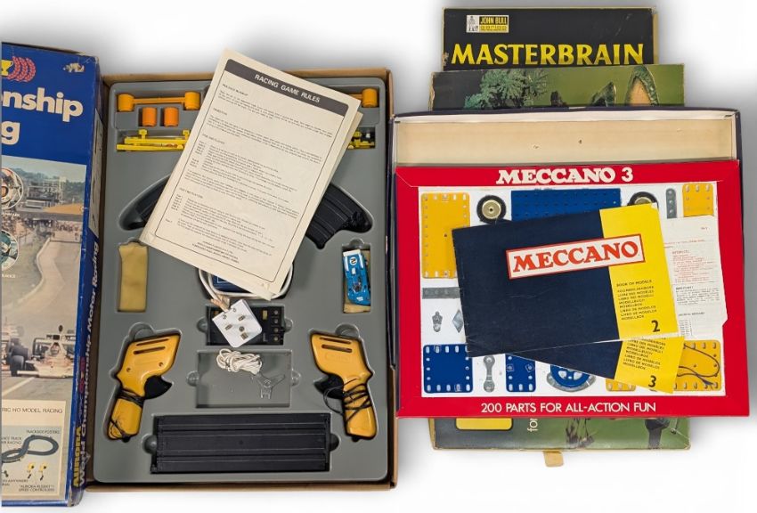 4x Vintage Games: Carpet Golf, Aurora World Championship Racing slot car set (missing one car), Masterbrain, Meccano set No.3, in good condition
