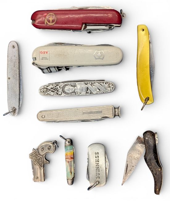 Collectable Penknives & Pipe Tools: a gun shape knife, a French wooden shoe, Guinness, Blackpool Tower, Lord Roberts victorious army penknife, a silver handled pipe tool, plus 4 modern penknives (10)