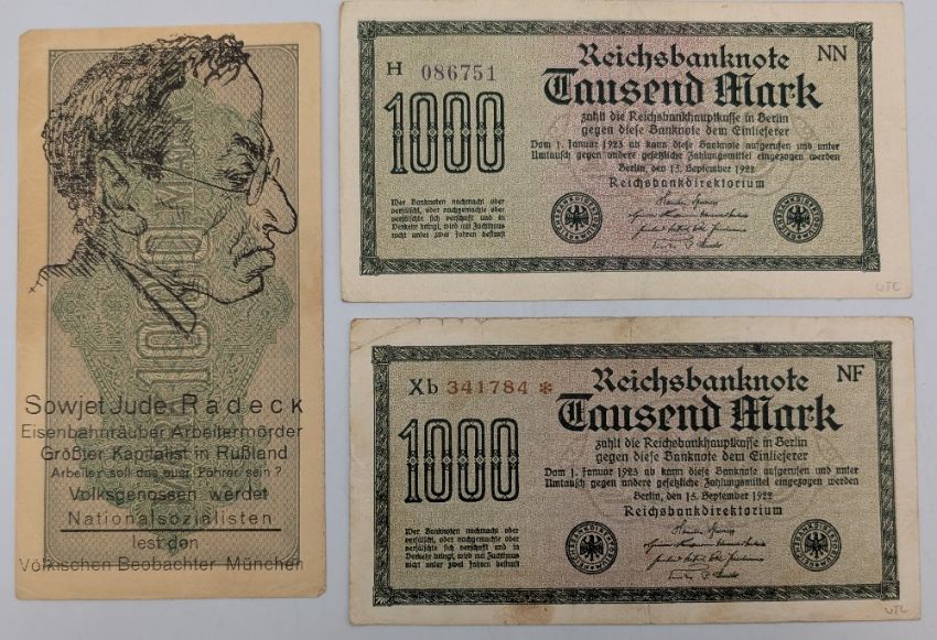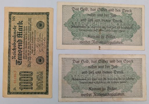 Anti-Jewish Propaganda Banknotes inflation era German banknotes over-printed with Anti-Semitic slogans. These were used as propaganda tools placing the blame for hyper-inflation which ruined Germany throughout the 1920s on the Jews. 'The gold, the silver and bacon, the Jew has taken from us and left us with this filth' condition A/G (4)