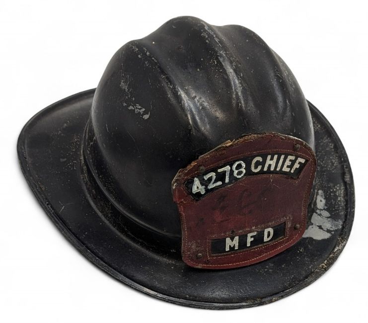USA Fire Helmet made by Cairns Bros with 4278 Chief MFD leather badge to front, missing its liner, some retouching done to numbers