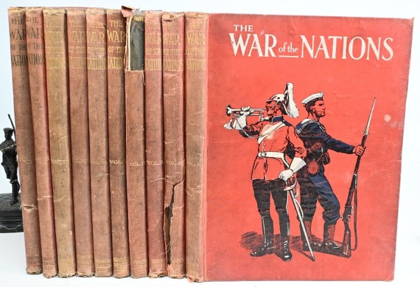 9x Volumes The War of the Nations Illustrated, pictorial record of the conflict of the nations. Volumes 1-7 and 9-11. Maroon cloth bound covers, a part run in fair condition (9)