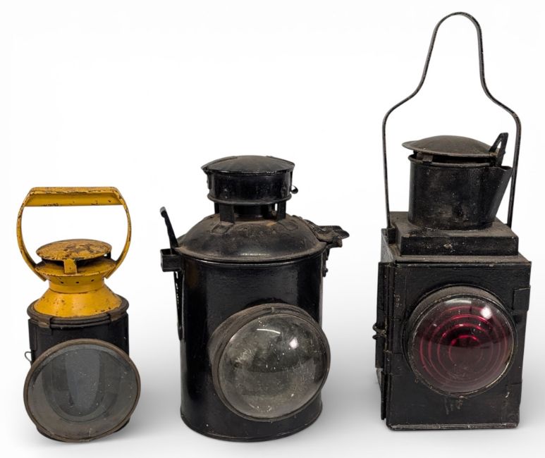 3x BR Railway Signalling Lanterns, to include a bullseye lantern and a hand signal lantern with 4 coloured glass sections, all having their internal burner sections