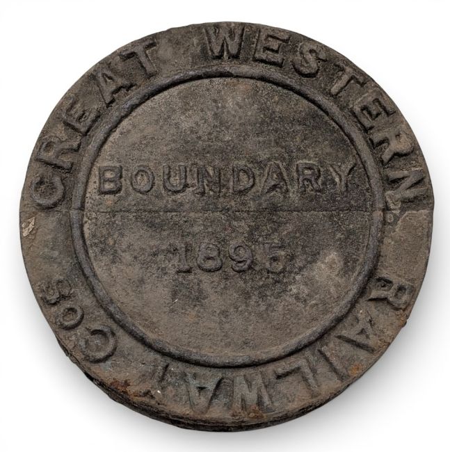 Railways - Railwayana GWR Cast Iron Boundary Marker. A GWR land ownership boundary marker boss inscribed "Great Western Railway Boundary 1895” (diameter 8"), heavy cast item