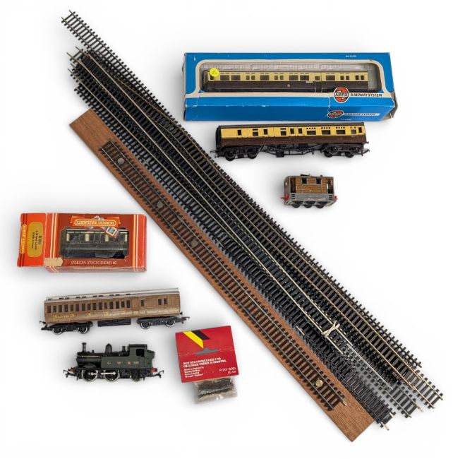 OO Gauge Locomotive Rolling Stock Track Accessories, to include Airfix GWR 1466 tank locomotive, Airfix GWR coaches, Hornby R213 4 wheeled coach, used straight track and unused track pins, buffers, and more in two boxes