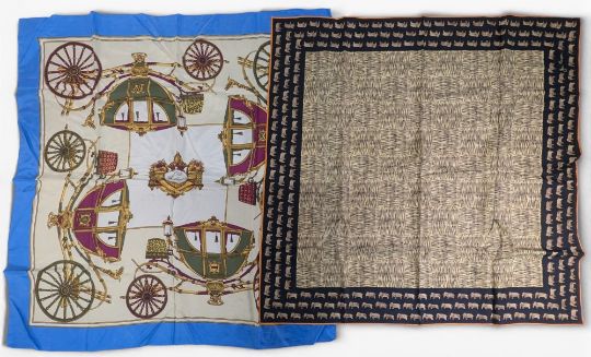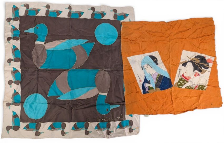 4x Vintage Silk Scarves - French, British and Japanese: two French ones by Monica, a Jim Thompson, and a smaller Japanese (with marks) in used condition