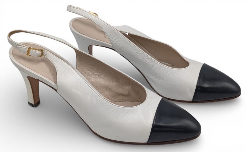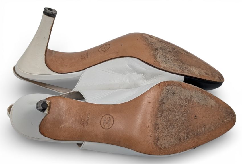 Chanel leather Slingback Heel Shoes, made in Italy size 39 ½, in used condition, one heal has a small fault and needs some TLC, with cloth bag