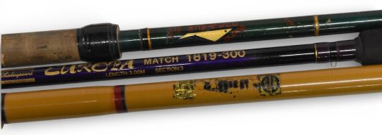 Shakespeare Europa Match 1819-300 carbon match rod, 3m 3pc, 23” composite handle with graphite sliding reel fittings, lined rings throughout, cloth bag, light use. Qualtak hollow glass rod, 9ft 6” 2pc with spare tip, 21” handle, alloy sliding reel fittings, stand off rings with lined tip/butt rings, cloth bag. Milbro hollow glass match/float rod, 12ft 6” 3pc, 26” handle with alloy sliding reel fittings, stand off rings with red agate butt/tip rings, cloth bag. Light use. (3)