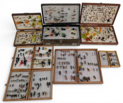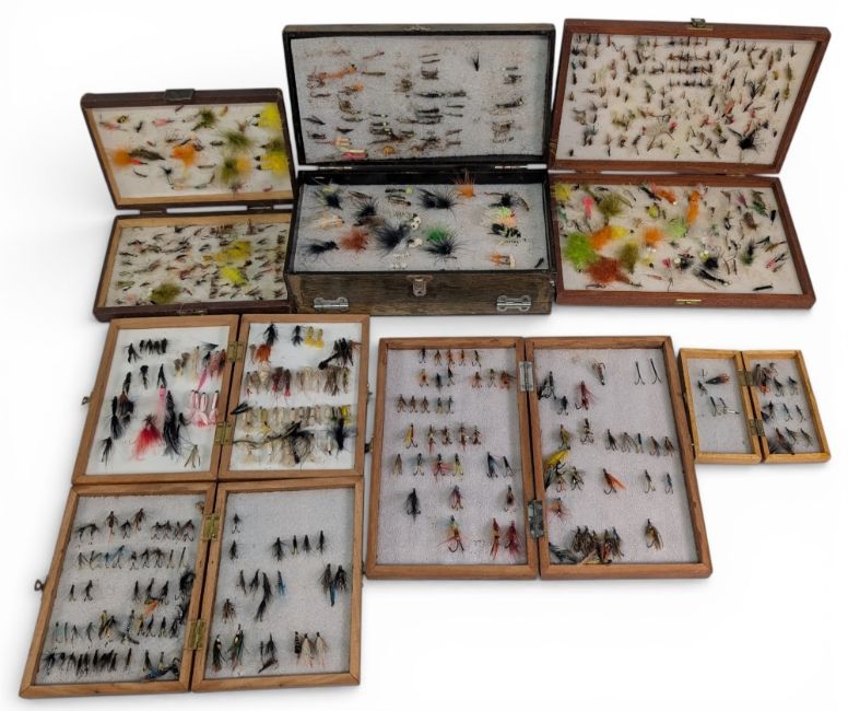 Wooden Fly Boxes, with assorted salmon and trout flies, in used condition