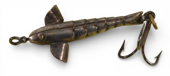Rare vintage Cleopatra lure, 1.5” long, fin stamped “Patent”, painted eyes, braised treble on split wing, fine early example