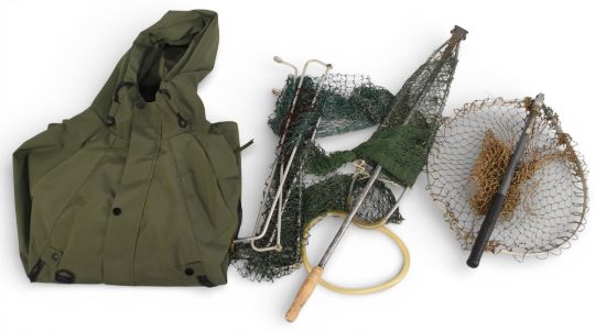 Green waterproof hooded Jacket, fashionable wear classic 1988 size 3XL, in very light used condition, 2 landing net heads, 2 folding landing nets, both unbranded