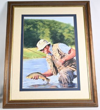 Brown Trout & Fisherman: fishing original painting by A Jones - size 58cm x 73cm