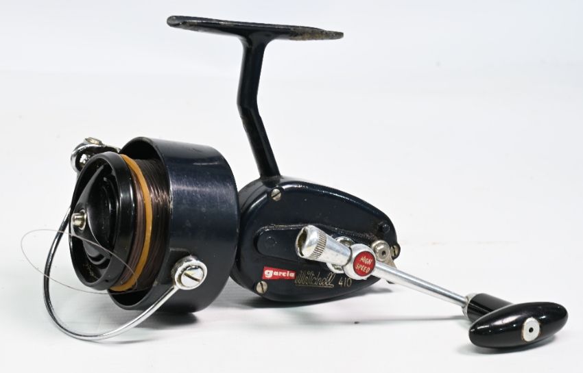 Garcia Mitchell 410 spinning reel, high speed model with torpedo handle, most original finish, c/w papers, spare spool and box, plus 4 spare spools in tubs.