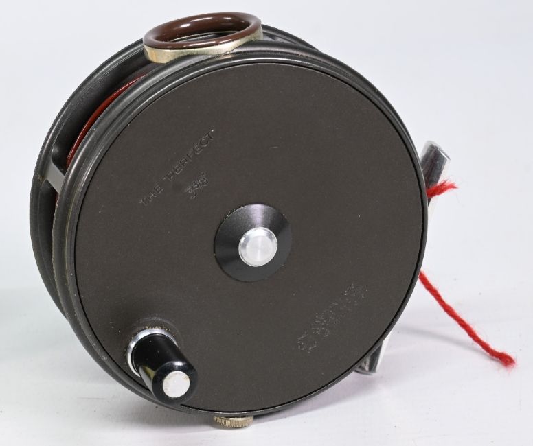 Hardy Bros “The Perfect” alloy trout fly reel, 3 5/8” narrow ventilated spool, black handle, milled rim tensioner, constant check, agate line guide, smooth alloy foot, MZC. Light use, runs well (spool screw broken)