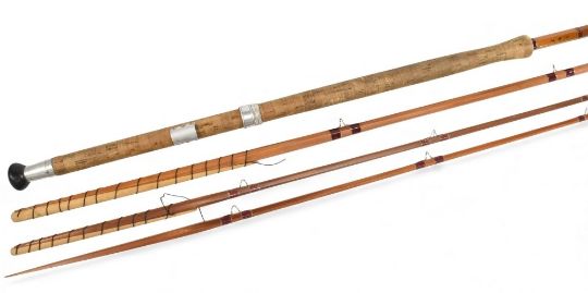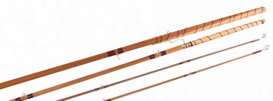 Sharpe Ltd Aberdeen impregnated split cane spliced salmon fly rod, 14ft 3pc line 10# with spare tip, No. 123-97, 25" handle with alloy fittings, lined butt/tip rings, with wood covers, and MCB Alex Martin Glasgow "The Thistle" split cane dry fly rod No 26168, 9ft 3pc alloy uplocking reel seat, lined butt/tip rings, twist lock joints, MCB (2)