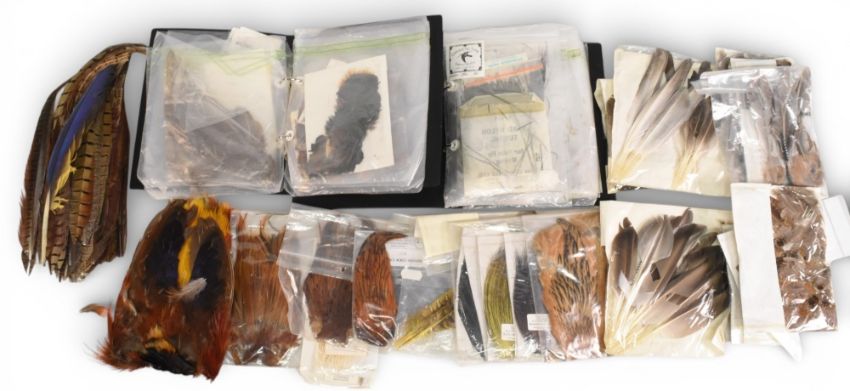 Bundles of tying material, as follows: Golden pheasant capes, peacock, moorhen flank feathers, Partridge coverts, pheasant tails, mallard wings, woodcock, partridge neck hackles