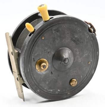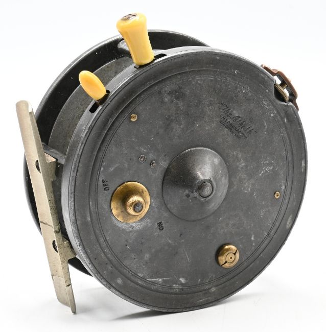 Allcock ‘The Atholl’ by Dingley 4” alloy casting reel stamped internally ‘D965’, twin handle, quick release spool, smooth alloy foot (professional repair), caged drum core, strapped rim tensioner, brake rim levers, rear optional check button, surface wear, good otherwise