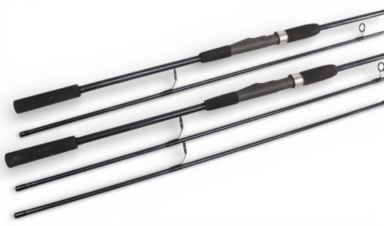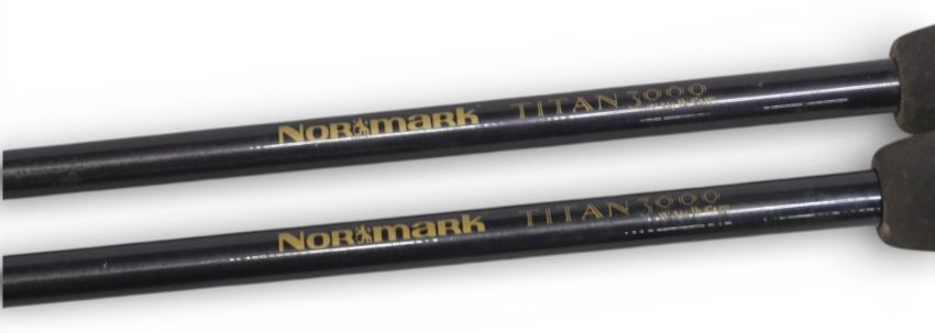 Pair of Normark Titan 3000 12’ 2 piece carp rods (one with spare tip), 2 1/4lbTC, blue finish, black whipped lined guides, Duplon handles, both good, no bags. (2)