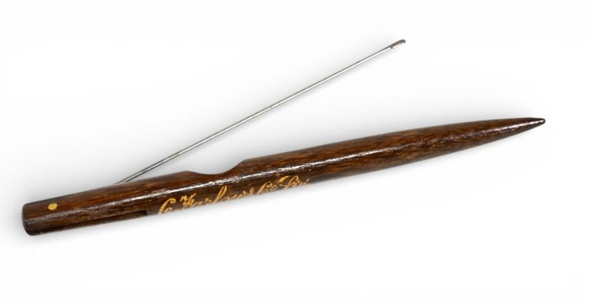 A very scarce Farlows Co Ltd London, wooden baiting tool with folding needle. Farlows branding in gold. Very nice