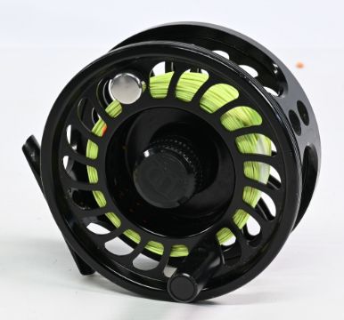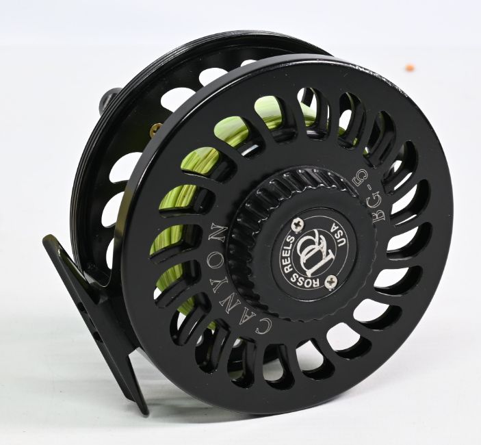 Ross USA Canyon BG-5 alloy salmon reel with spare spool, 4” ventilated spool and frame, quarter turn spool release counter balanced handle, large rear spindle tensioner, constant check. Reel in neoprene pouch, both in original boxes. Very light rim wear, runs smooth. (2)