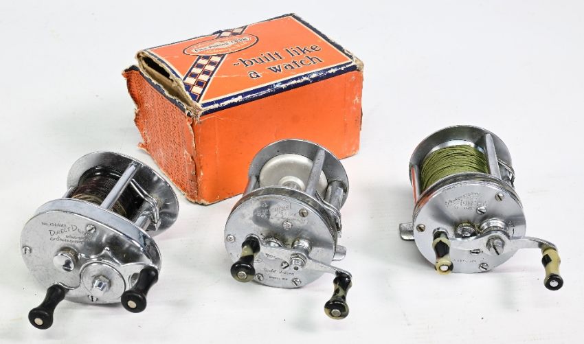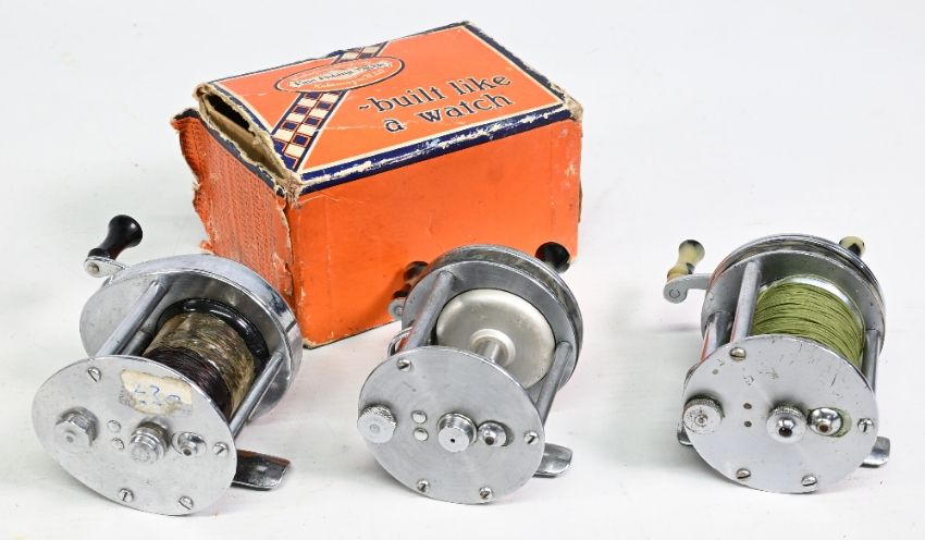 3x USA and Canada - Shakespeare multiplier reels to incl 1922 Wondereel De Luxe John Inglis Canada with twin handle, optional check button, tensioner in maker’s card box(poor), plus an ‘Ideal 1963’ made in USA reel with optional check button and tensioner (heavy wind) and a No 1924MS Direct Drive Mono-Spool Model EE made in USA with optional check button, twin handle – general condition throughout A/G overall