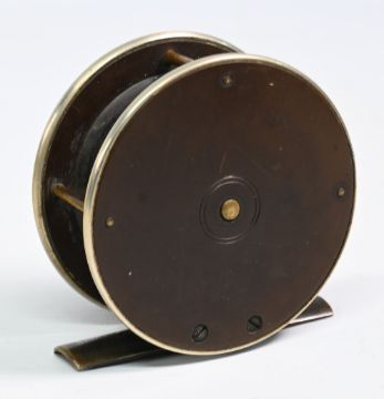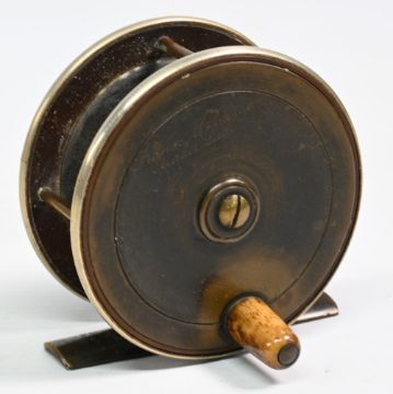 Francis Walbran of Leeds Maker 3” ebonite and alloy plate wind fly reel with smooth brass foot, maker’s detail to face, sticking when wound, otherwise appears in good condition