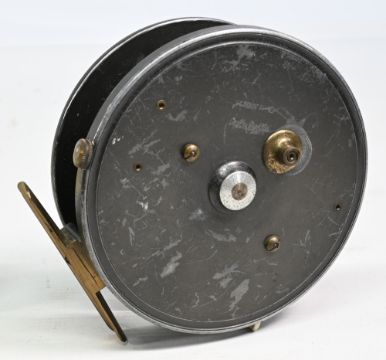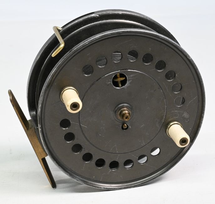 JW Young & Son retailed Ogden Smiths patent 4 ½” casting reel twin handled, patent brake lever, rim tensioner, smooth brass foot, optional check button, quick release spool