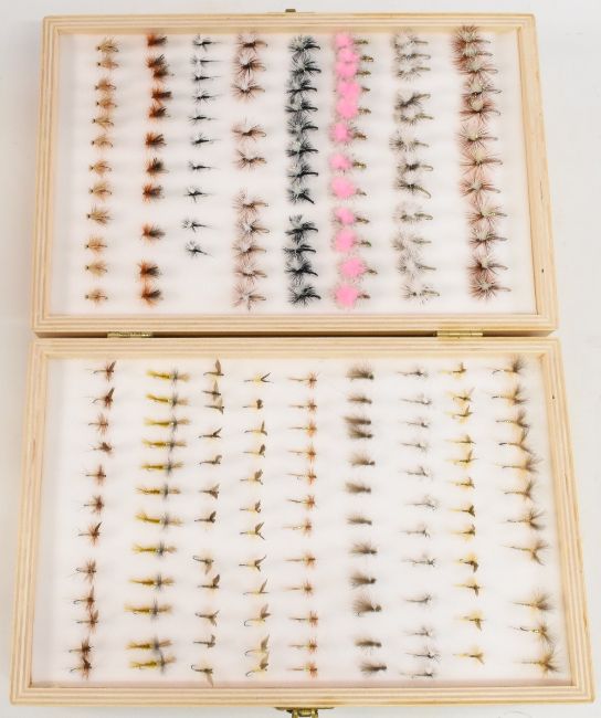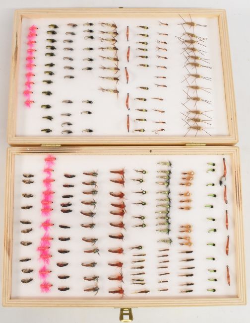Superb collection of trout/grayling flies, including gold heads, shrimps, buzzers, tiny up wing dry flies, daddy long legs, superb collection, in a 4 layer wooden fly reservoir