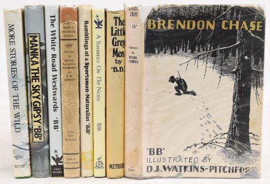 Mixed books by ‘BB’ and illustrated by D J Watkins-Pitchford to include Brendon Chase 1947, The Little Grey Men 1975, A Summer on the Nene limited edition (412/600), Ramblings of a Sportsman-Naturalist 1979 ex-library, The Sportsman’s Bedside Book 1948, The White Road Westwards 2001, Manka Sky Gipsy 1979 ex-library, More Stories of the Wild 1977, (8) in generally VG-G condition with some small wear/tear