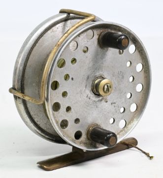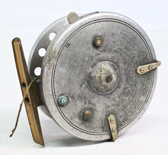 Hardy Bros Longstone alloy centrepin reel with 4” backplate twin handle, Bickerdyke line guide smooth brass foot, rim lever, surface wear apparent