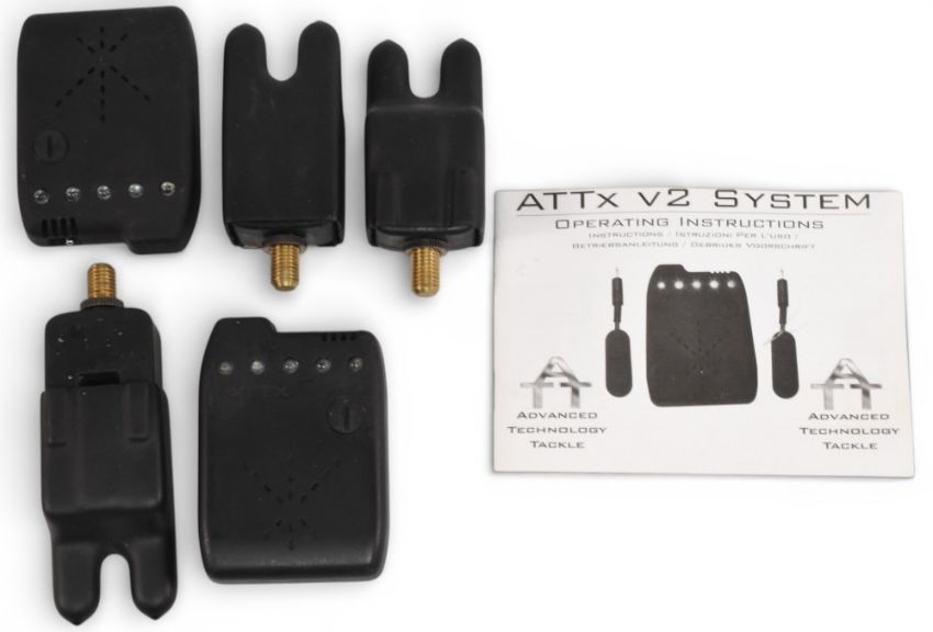 Set of 3 AttxV2 electronic bite alarms, with waterproof slip covers, and 2 x transmitter receivers, with instructions