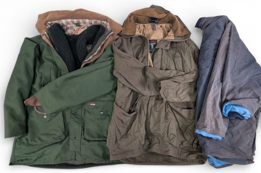 3x Fishing Shooting Coats, a wax coat quality country wear size XXL, a good Musto Country Gore Tex lined coat fleece liner size 46, a Ventile double layer jacket size XL