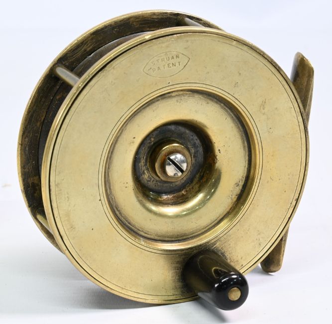 Struan Patent polished brass fly reel c1895, 4” solid spool, large brown domed handle, 6 pillar frame and full foot, good check. Runs well