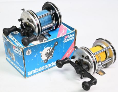 2x Abu Garcia Ambassadeur 6500C multiplier reels foot stamped 89-0-91-92 and 160017/10 – both with twin handles, star drag, signs of use apparent – with maker’s card box