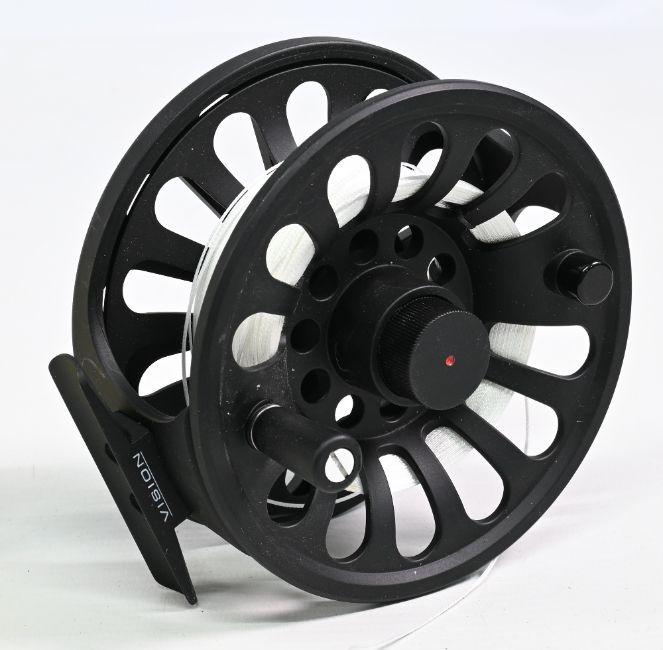 Vision 910 Deep Salmon fly reel 4” dia’ in black finish, rear drag adjuster, lightweight construction, counter balance weight, overall appears in good condition, very light use