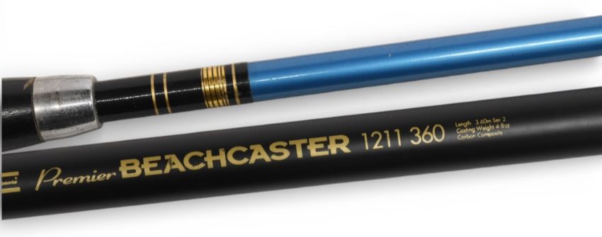 Shakespeare Premier Beachcaster 1211-360 carbon rod, 3.6m 2pc, CW 4-8oz, composite grips, uplocking reel seat, lined rings, MCB. Very light use. Unnamed solid glass heavy boat spinning rod, 10ft 2pc, 27” wood handle, alloy uplocking reel seat, lined rings, no bag (2)