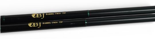 The B J (Bob James), barbel twin tip rod, 12’ 2 piece with additional quiver tip top, detachable cork handle, screw reel fitting, very clean, plus an additional mid and top section, (only 1 butt section), in 2 fitted cloth bags. (2)