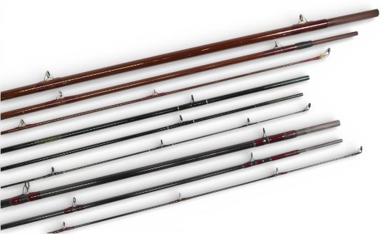 Shakespeare Carbo Featherlite graphite salmon fly rod 1728-390, 3.9m 3pc line 8/10#, 26” handle, down locking reel seat lined rings, MCB, light use. Aiken Regent Deluxe salmon carbon fly rod, 15ft 3pc line 10/11#, 30” handle, down locking reel seat, lined rings, MCB, light use. Unnamed carbon salmon fly rod, 15ft 3pc, 252 handle, alloy uplocking reel seat, lined rings, cloth bag. Light use. (3)