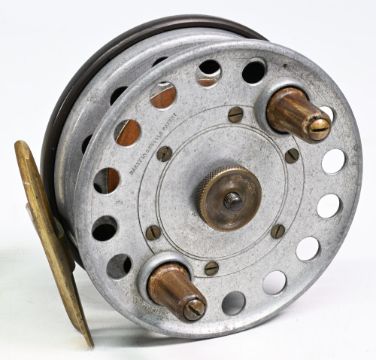 Milward Marston Crossle Patent 4” ebonite, alloy and brass star back combination reel with wood drum core, twin handle, maker’s details to face, perforated construction, optional check button, runs well, c1920s