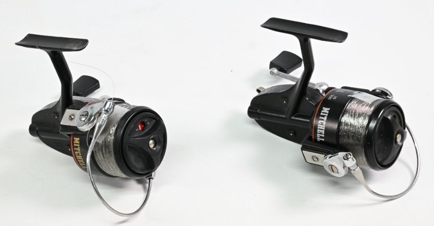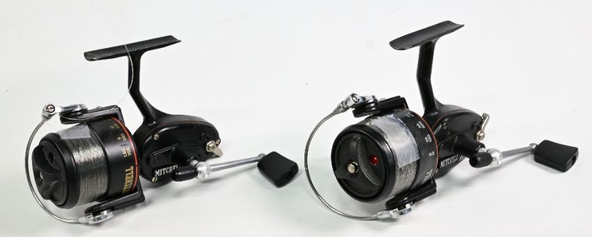 2x Mitchell 300S fixed spool reels both feet stamped 248209, LHW examples, rear adjusters, in good clean condition overall – plus 3x Mitchell spools