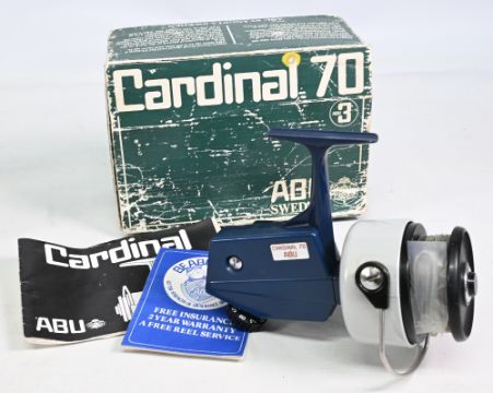 ABU Cardinal 70 fixed spool reel in blue finish, foot stamped 770500, optional check, rear adjuster, folding handle, appears in good, clean condition, with maker’s card box (worn)