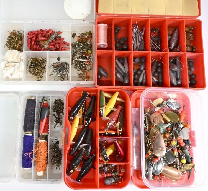 Collection of metal spinners, assorted weights, bait mount pins, Devon minnows, hooks and threads, all you see in image.