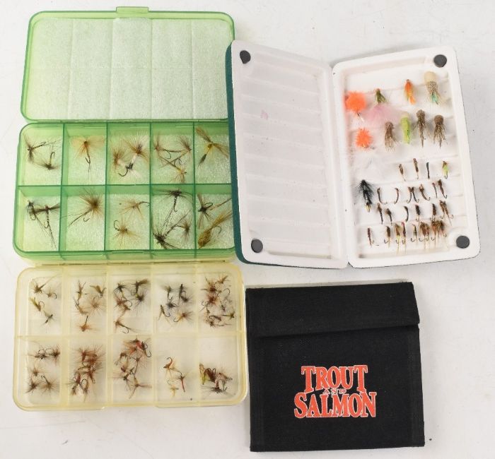 Bonnand clear plastic box 4" x 6" with 10 sections and a large collection of dry flies. Bonnand clear plastic box 4" x 6" with a quantity of mayflies. An Orvis foam box with ripple interior with quantity of still water flies. Unused trout and salmon cloth wallet with scissors. (4)