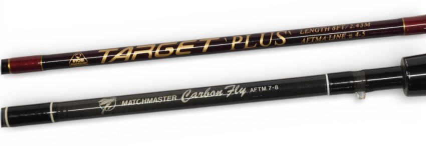 Ryobi Masterline Target Plus carbon trout fly rod, 8ft 2pc, line 4/5#, alloy uplocking reel seat, lined stripping rings, cloth bag, light use. Match Master carbon trout fly rod, 9ft 6” 2pc line 7/8#, composite handle, alloy down locking reel seat, lined butt/tip rings, cloth bag, light use. (2)