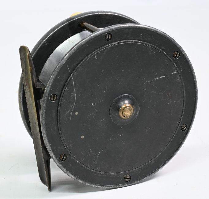 P D Malloch Maker, Perth, alloy salmon fly reel, 4” wide spool with white handle, good check, 6 pillar frame, full brass foot, good finish