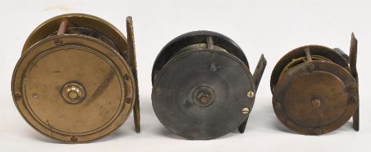J Cummins Maker, Bishop Auckland 3 ¼” brass reel by Malloch, original pillars and screws, turns well, a 2 ¾” unnamed brass plate wind, constant check, and a 2 ¼” brass crank wind reel, all working. (3)