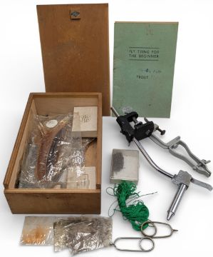 Vintage Veniard Fly-tying Kit: lidded wooden box with ‘C’ clamp vice, tools and accessories (feathers in poor condition)