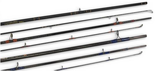 Bruce & Walker carbon spinning rod, 11ft 2pc, 26” handle, Fuji down locking reel set, lined rings, cloth bag (some loss of finish to butt). Daiwa made in Scotland graphite coarse rod, 13ft 6” 3pc, 27” handle with uplocking reel seat, lined rings, cloth bag. Ryobi Astroblack AB-2095 carbon coarse rod, 9ft 6” CW 20-40g, 24” handle, alloy sliding reel fittings, lined butt/tip ring, MCB, light use. (3)