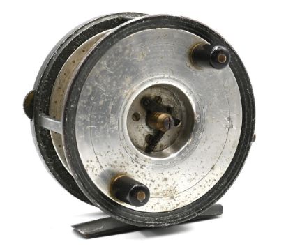 Rare C Farlow & Co, Ltd, London 4" drum casting reel - adjustable central boss and spring bar latch, brass brake lever, ratchet on/off dial controls to rim, mini pins to rear of spool flange, turns well with a loud check clicker, good original finish.