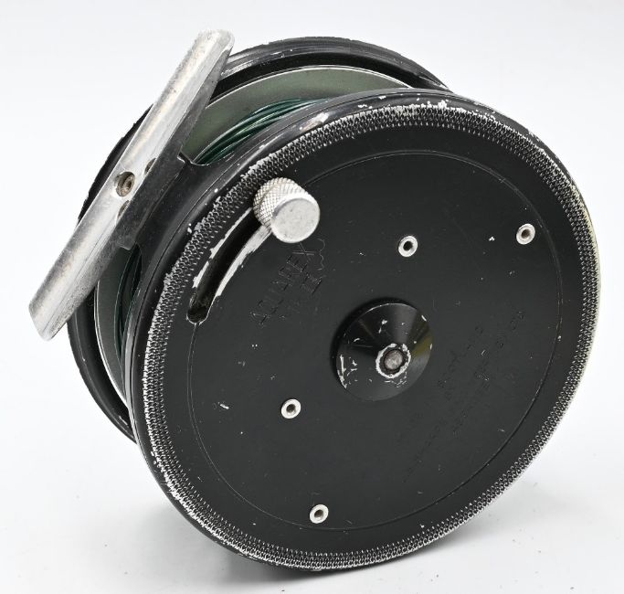 J Sharpe of Aberdeen Scotland Aquarex MkII 4" alloy fly reel and spare spool with smooth alloy foot, black handle, rear plate adjuster, line guide - with signs of surface wear (2)